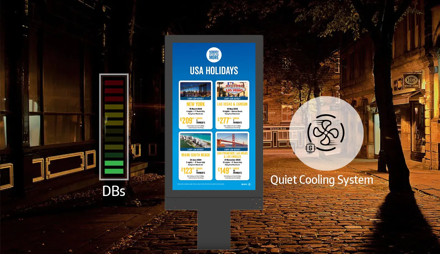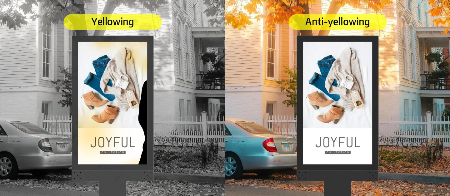 Sunlight and high temperatures are major threats to outdoor displays, often causing screen failures. Our outdoor enclosures, equipped with Eclipse Shield, protect against UV rays and excessive heat while high luminance efficiency technology ensures lower energy use and operating temperatures without sacrificing brightness, preventing issues like screen blackening and yellowing.
